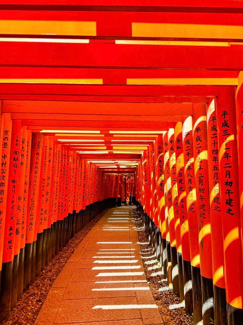 Bekannt ist der Shintō-Schrein insbesondere durch die tausende roten Torii, die den Berg hinauf eng aneinandergereiht sind.